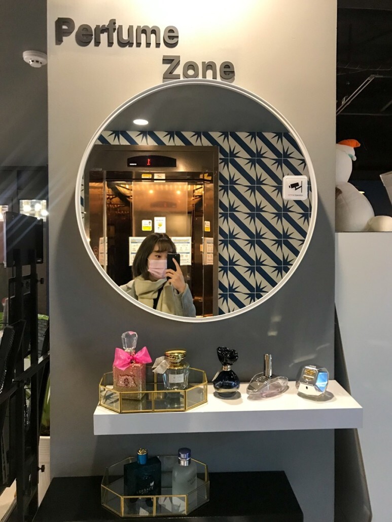 엘리베이터 바로 앞에 있는 공간인데, 향수가 비치되어 있어서 원하는 향수를 맘껏 뿌리고 나갈 수 있다.