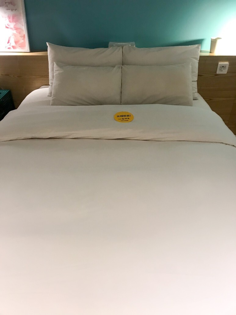 침대 가운데에 노란 딱지같은게 있어서 뭔가 봤더니 침구 교체 후 관리자가 놓고 간 교체완료 스티커였다.