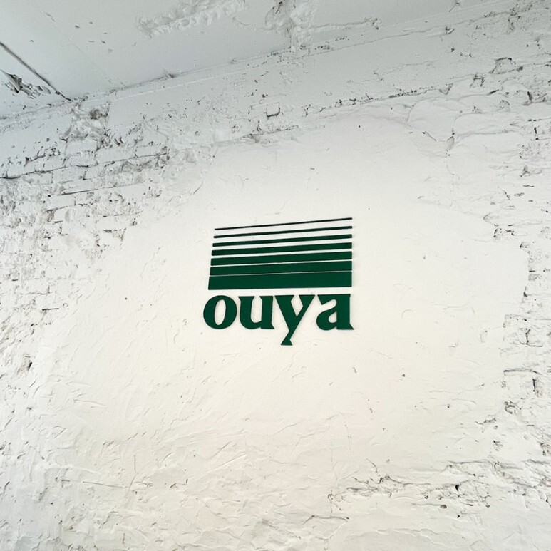 오우야의 화이트 외관 & 초록색 로고와 통창으로 깔끔한 외관을 지니고 있다.