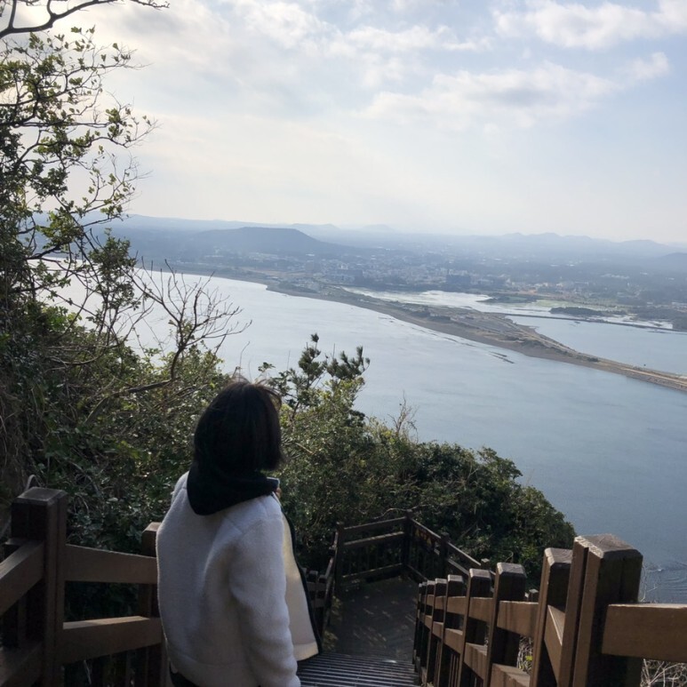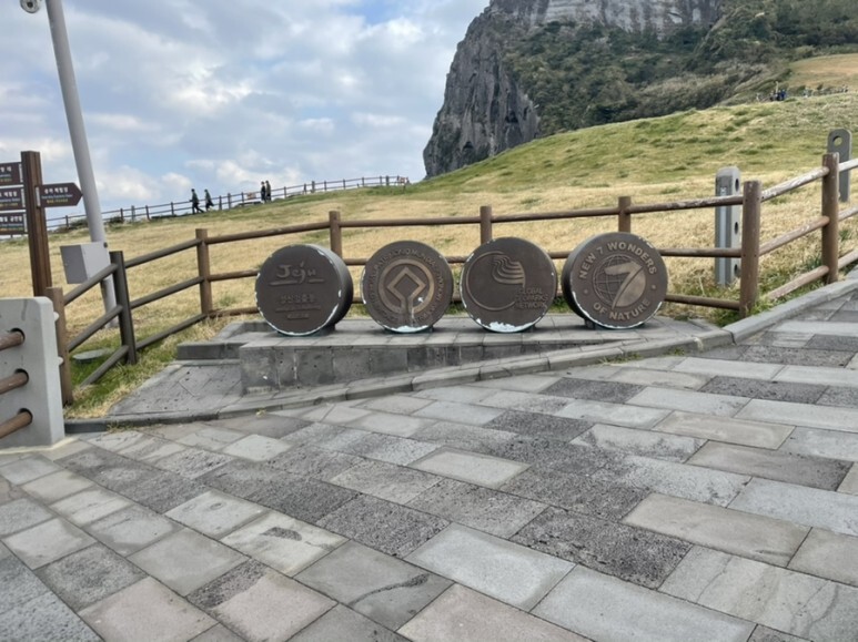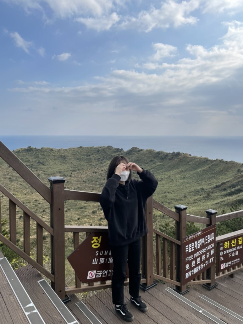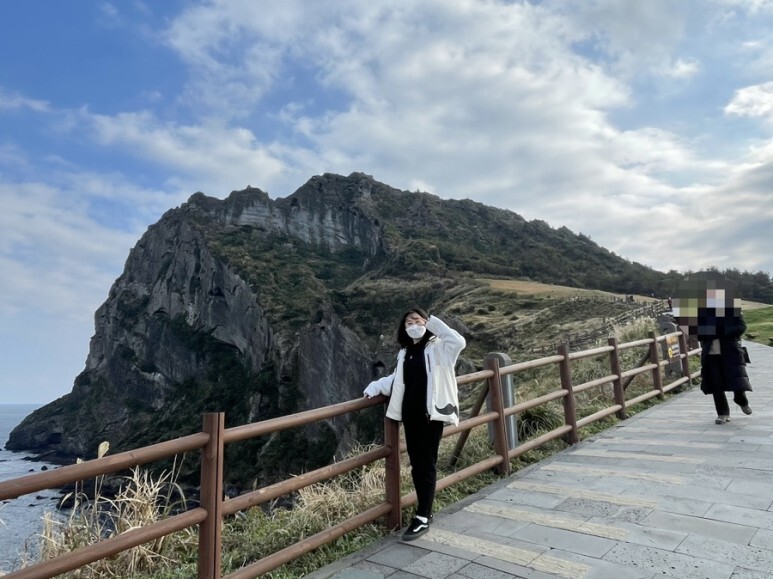 아쉬움을 뒤로하면서 성산일출봉을 배경으로 사진 하나 남겼다. ෆ