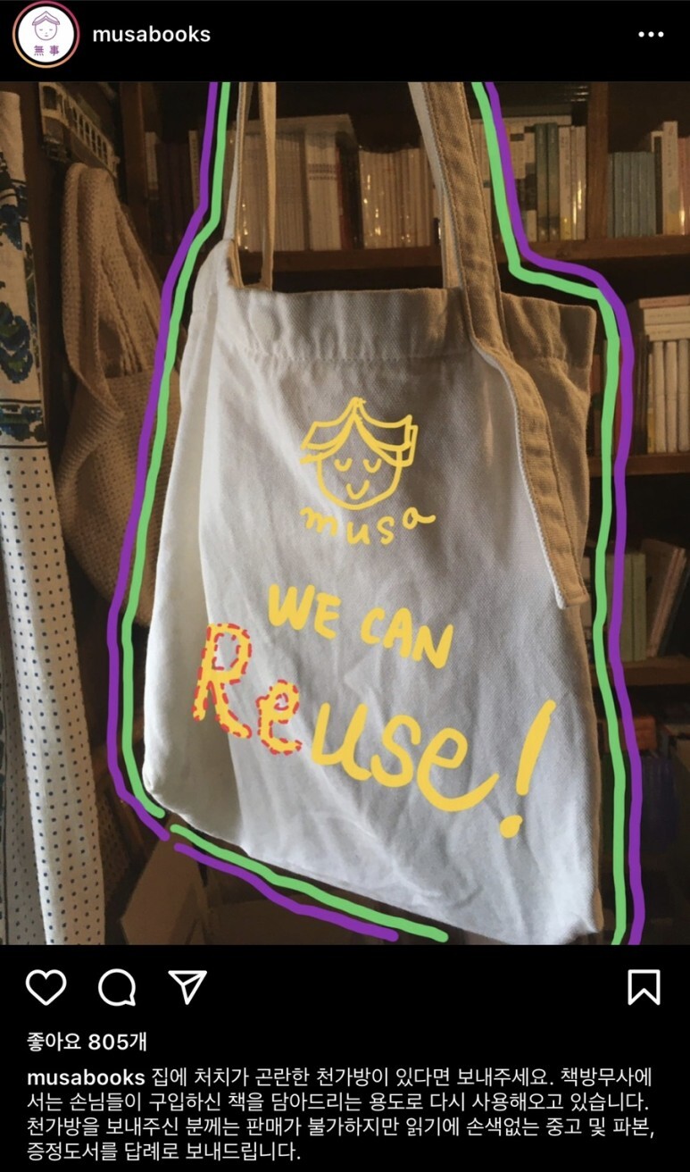 사람들이 사용하지 않는 처치 곤란한 천 가방을 택배로 보내주면 책방무사에서는 중고 및 파본 도서를 답례로 보내주는 것.